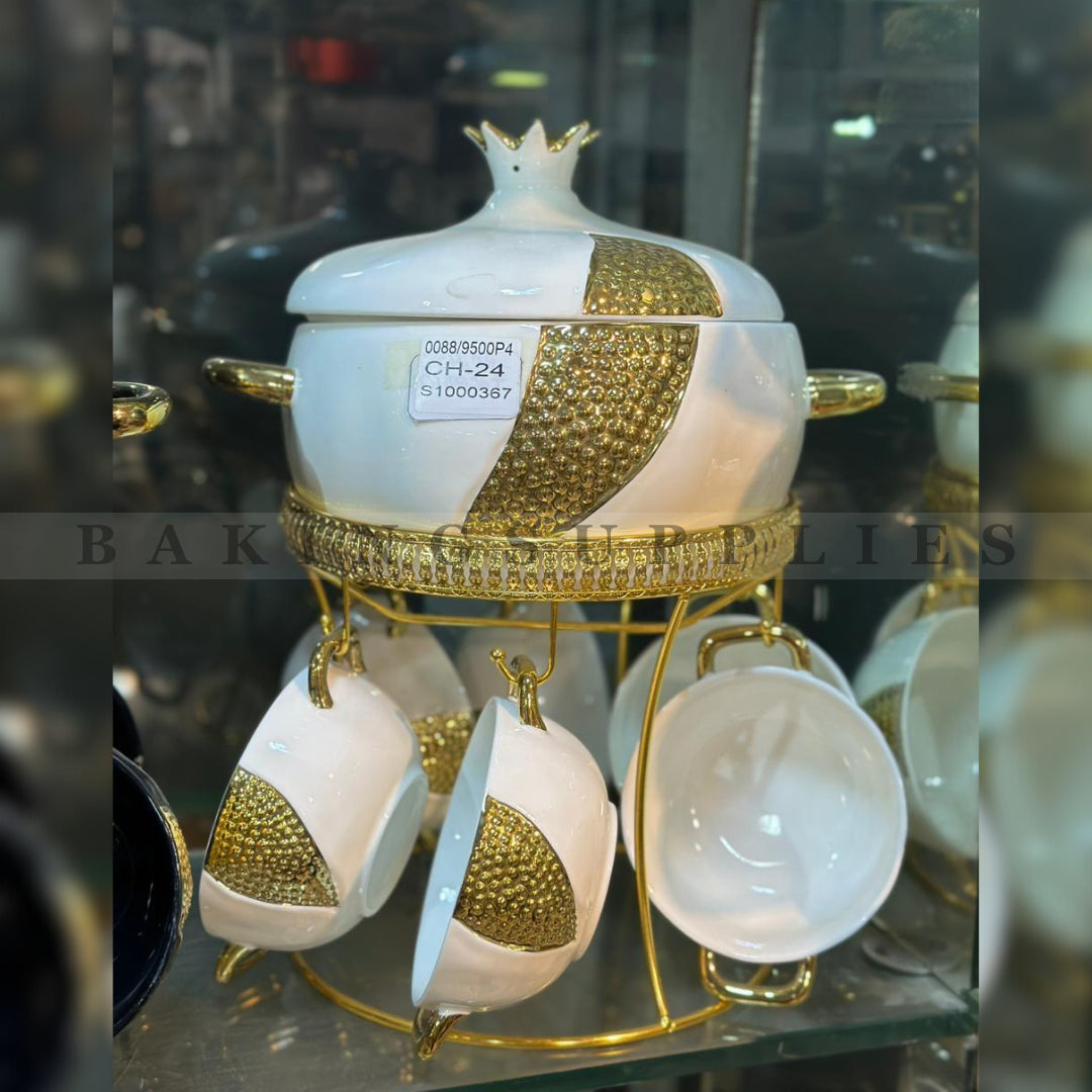 Crafted from high-quality ceramic and paired with a durable gold-tone metal stand, this set is ideal for family dinners, formal gatherings, and special occasions. The hanging bowl design keeps your table organized while adding a luxurious touch to your presentation.