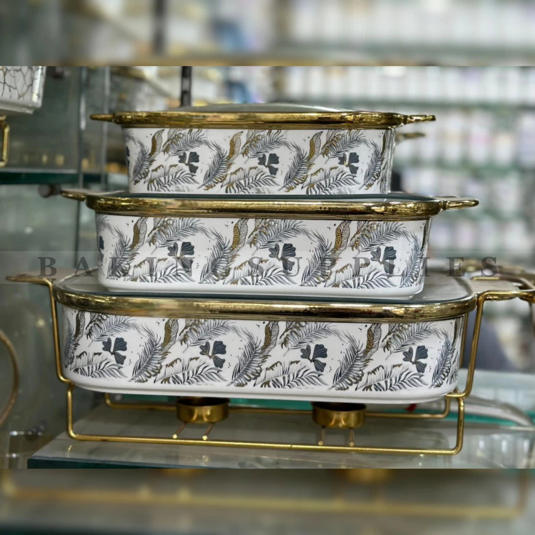 Upgrade your serving experience with this luxurious set of 3 chafing dishes, designed to combine elegance with functionality. Each dish features a durable ceramic body, a clear glass lid for easy food visibility, and a premium gold stand that adds a sophisticated touch to any setup.